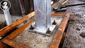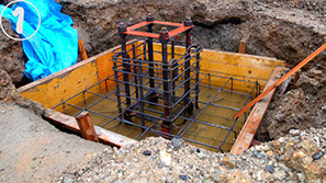 柱を立てる基礎を制作します。鉄筋とコンクリートを使い、丈夫に仕上げて行きます。水平、角度を確認し、慎重に作業します。